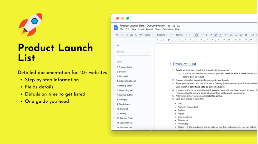 1. Expertly Curated Documentation for 40 SaaS Sites: Our guide meticulously details the submission process for 40 carefully selected SaaS submission sites, each chosen for its potential to drive visibility. This level of detail saves you at least 30 minutes per site in preparation and research, amounting to over 20 hours of saved effort—time that can be better spent on strategic development and growth.